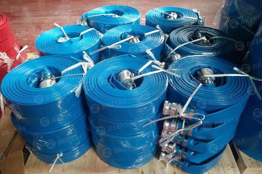 Manguera plana flexible azul de PVC reforzada con tejido de poliéster para uso general.